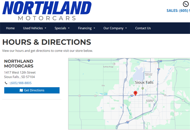 Northland Motorcars serves South Dakota, Iowa, Minnesota, Nebraska and The Surrounding Area. All vehicles are Fully Serviced & Inspected! Please Contact Us For Your No Hassle Experience and Save Time In The Store By Starting The Process Online. We Look Forward To Taking Care Of Your Car Needs Today and In The Future! Free Carfax Report! Financing (WAC) and Vehicle Service Contract Options Available! Come Stop By, Call Us at 605-988-8805 or Schedule Your Test Drive Online Today! All Trades Welcome! We make the buying experience painless and pleasant with our aggressive market pricing. Located at 1417 W 12th St Sioux Falls SD 57104.