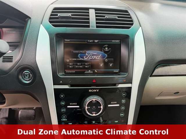 The leather seats in this Ford Explorer are a must for buyers looking for comfort, durability, and style. See what's behind you with the back up camera on this Ford Explorer. It has a clean CARFAX vehicle history report. The rear parking assist technology on this vehicle will put you at ease when reversing. The system alerts you as you get closer to an obstruction. Start this 2015 Ford Explorer from inside with remote start. Bluetooth technology is built into the vehicle, keeping your hands on the steering wheel and your focus on the road. This 1/2 ton suv offers Automatic Climate Control for personalized comfort. This model has a V6, 3.5L high output engine. The vehicle is painted with a sleek and sophisticated black color. This Ford Explorer has four wheel drive capabilities. Set the temperature exactly where you are most comfortable in this unit. The fan speed and temperature will automatically adjust to maintain your preferred zone climate.