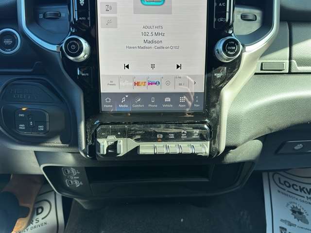 | Visit DriveUconnect.com; For More Info | Call 800-643-2112; Integrated Voice Command with Bluetooth; Emergency Vehicle Alert System (EVAS); 12" Touchscreen Display; Premium Cloth 40/20/40 Bench Seat; Glove Box Lamp; Auto Power-Folding Mirrors; Footwell Courtesy Lamp; Anti-Spin Differential Rear Axle; Mirror Running Lights; MOPAR Deployable Bed Step; Alexa Built-In; Apple CarPlay; Power-Adjustable Convex Aux Mirrors; Forward and Reverse Utility Lights; Locking Lower Glove Box; Remote Start System; 9 Alpine Speakers with Subwoofer; Disassociated Touchscreen Display; Dual Glove Boxes; 2nd Row in Floor Storage Bins; Rear View Auto Dim Mirror; Rear Dome with On/off Switch Lamp; LED Bed Lighting; Connectivity - US/Canada; GPS Navigation; 4G LTE Wi-Fi Hot Spot; GPS Antenna Input; Exterior Mirrors with Heating Element; SiriusXM with 360L; Global Telematics Box Module; Connected Travel and Traffic Services; Foam Bottle Insert (door Trim Panel); Black Exterior Mirrors; Big Horn Instrument Panel Badge; Off-Road Info Pages; Selectable Tire Fill Alert; Trailer Tow Pages; HD Radio; Uconnect 5 Navigation with 12.0" Display Radio; Power Heated Folding Telescopic Mirrors; Exterior Mirrors with Supplemental Signals; Steering Wheel Mounted Audio Controls; Exterior Mirrors Courtesy Lamps; Air Conditioning ATC with Dual Zone Control; MOPAR Spray in Bedliner; Power Adjust Mirrors; Luxury Steering Wheel; Power Telescoping Mirrors |