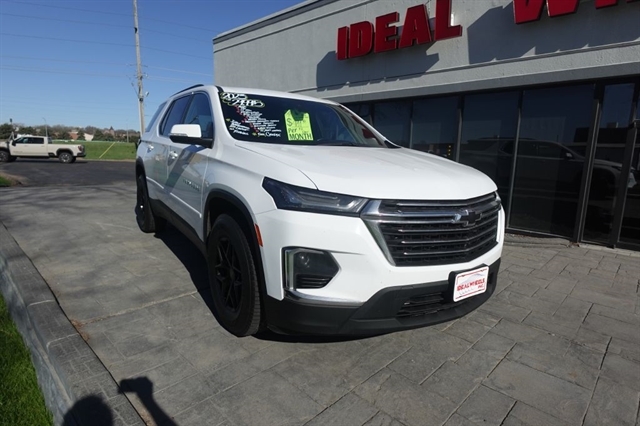 Here's a sharp looking 2023 Traverse loaded with great options and priced to sell for only 29,995.00. The Traverse is a great midsize CUV that provides nearly as much interior room as the fullsize gas guzzlers but with much better fuel economy and a more car like ride and you still have the security of the All Wheel Drive to get you where you need to go. The options on this unit include All Wheel Drive, LT Trim Package, Navigation, Rear View Camera, Sunroof, Apple Car Play, Leather Seats, Dual Power Seats, 2nd Row Bucket Seats, 3rd Row Seating, XM Radio, 17'' Black Alloy Wheels, and of course a long list of Standard Power and Safety Features. We offer bank financing with excellent rates and terms right here at the dealership, stop and see why so many people will only purchase their used vehicles from Ideal Wheels with the original Ideal Advantage which provides no labor charge on most repairs for as long as you own the vehicle. Don't forget to check out the complimentary Carfax.