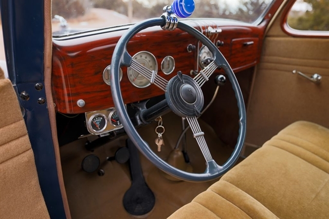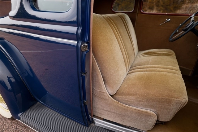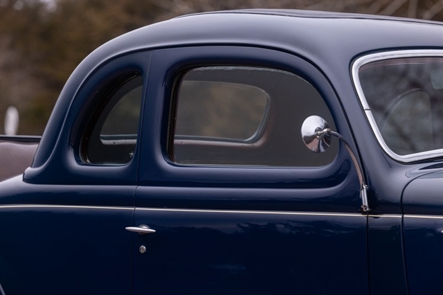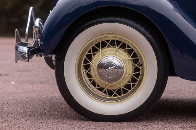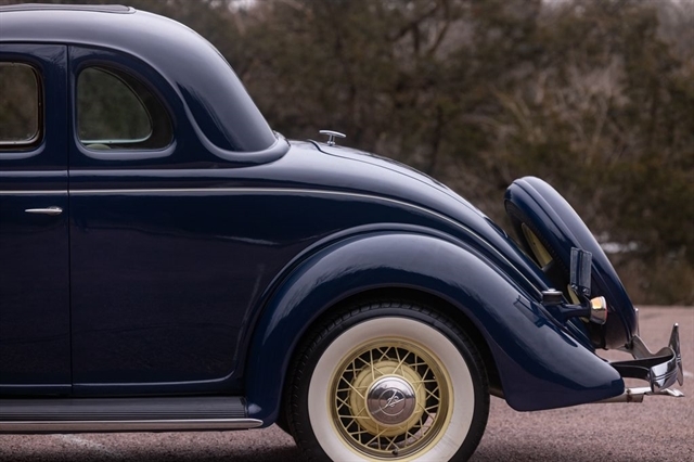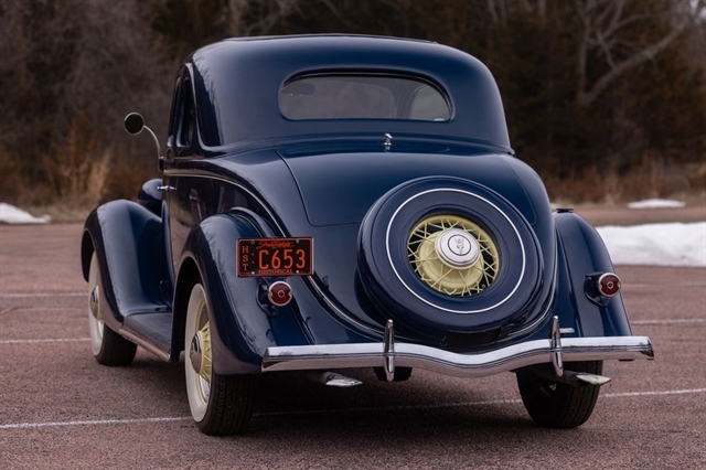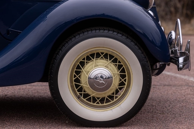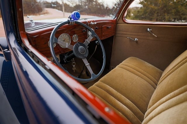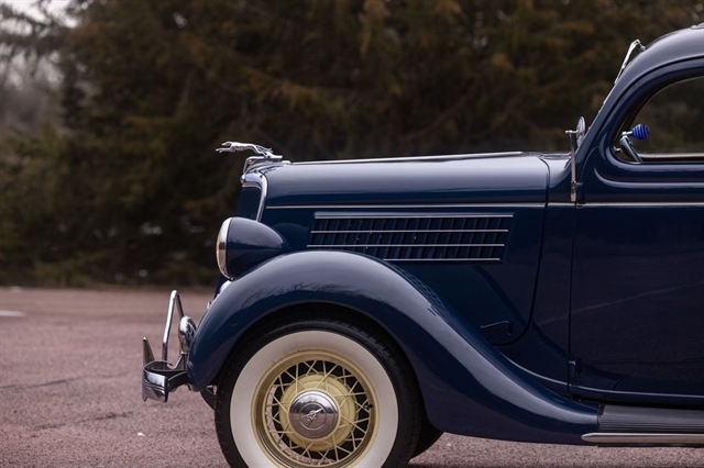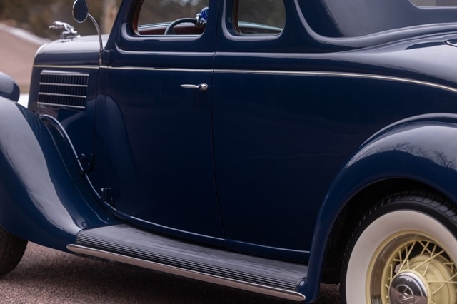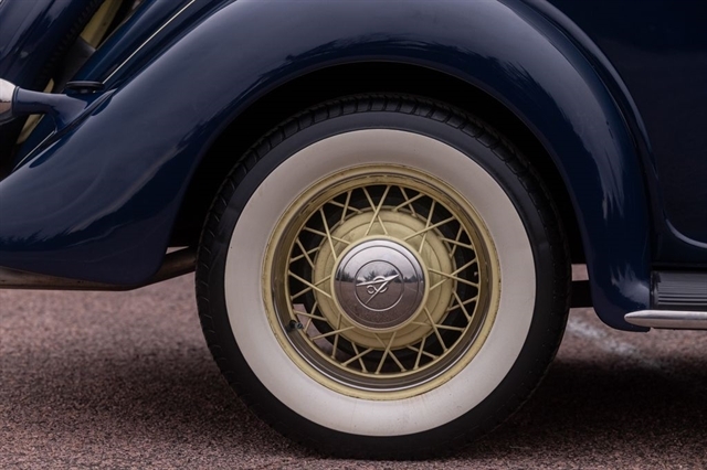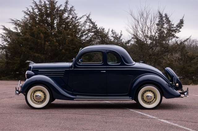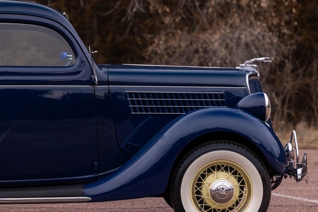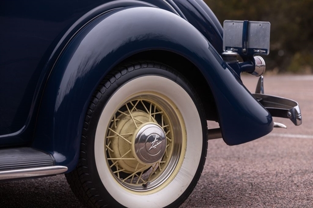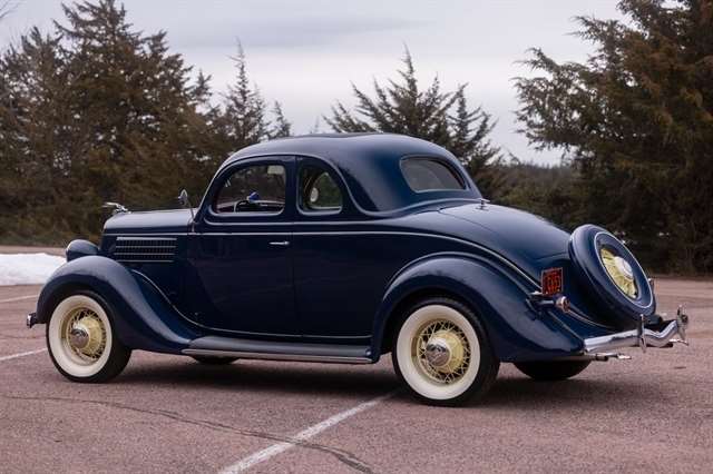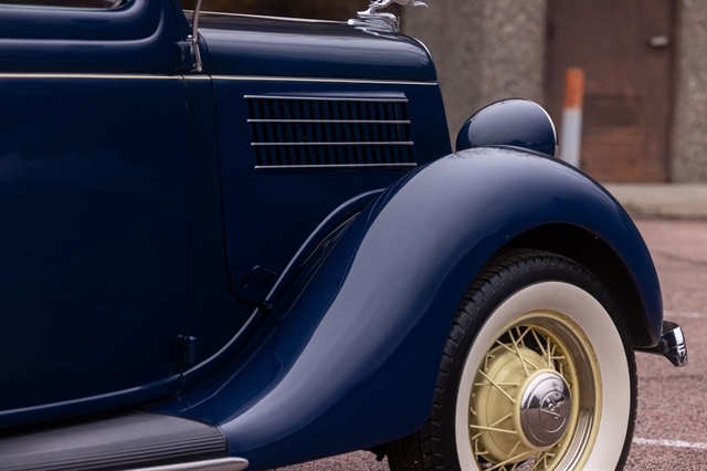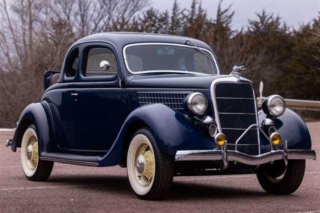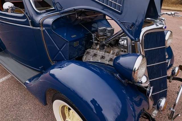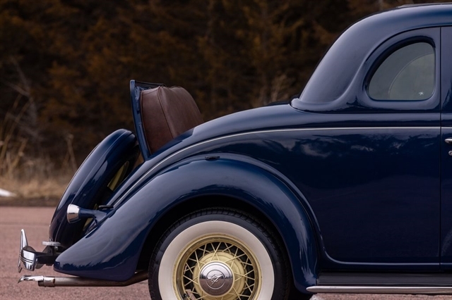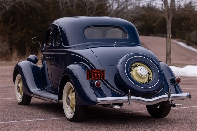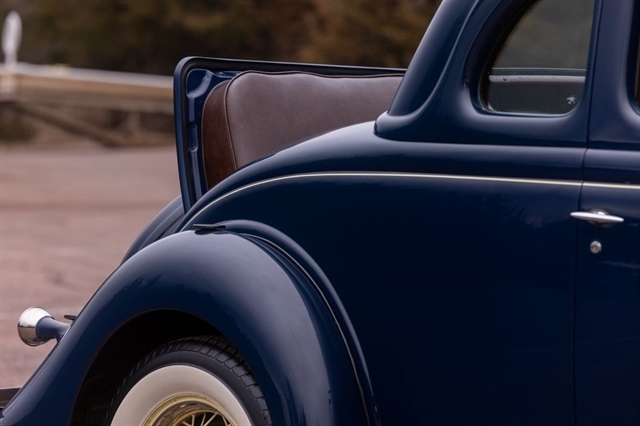 Finished in period-correct Washington Blue over a tan mohair interior, this coupe is a head-turner from every angle. The all-steel body features integrated fenders and streamlined bodywork that marked Ford`s major 1935 design evolution. Highlights include 16-inch Kelsey-Hayes wire wheels, wide whitewall tires, a factory rumble seat, fold-down rear window, classic banjo steering wheel, rear-mounted spare, and period-correct instrumentation throughout.