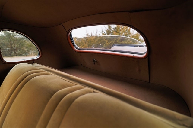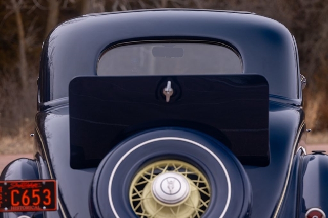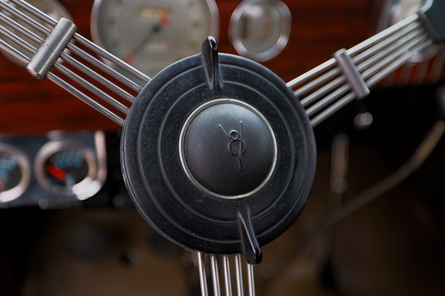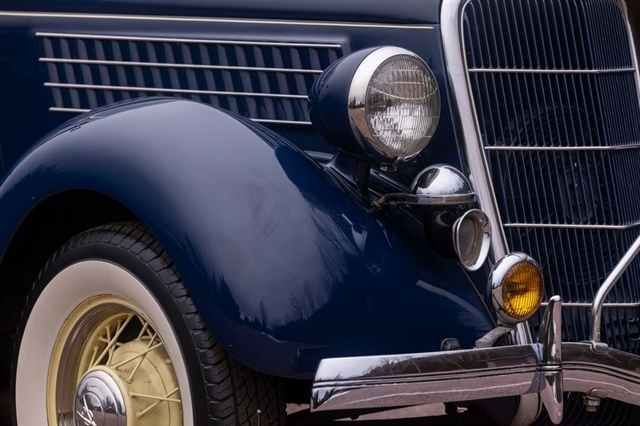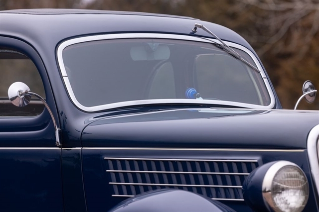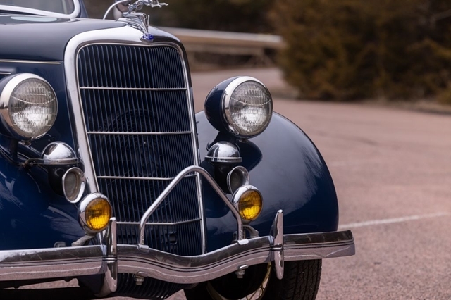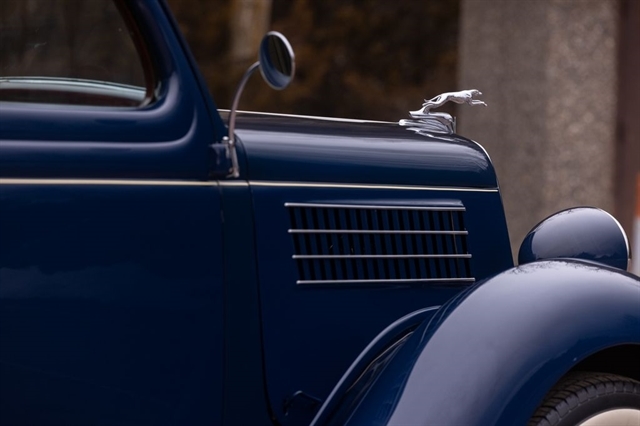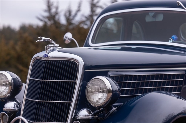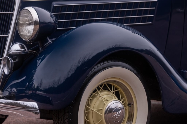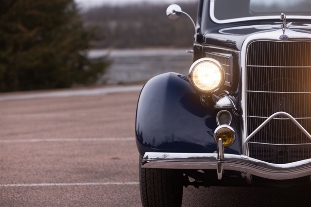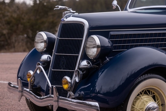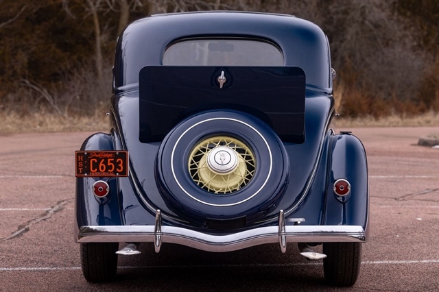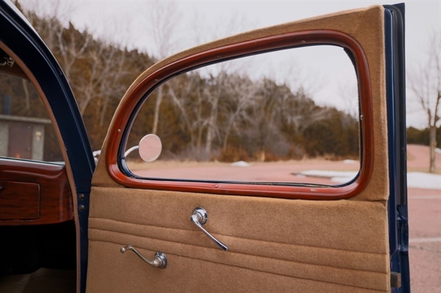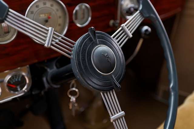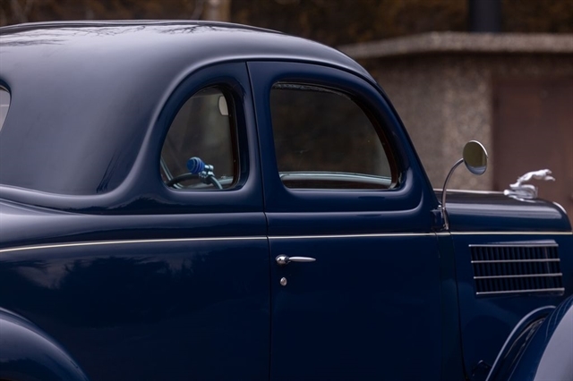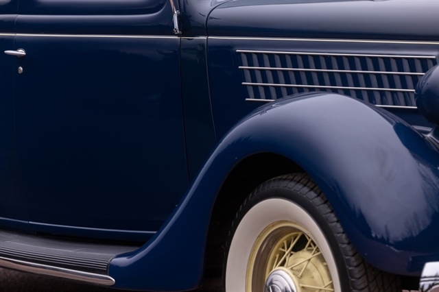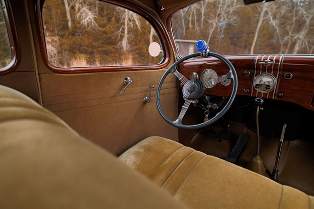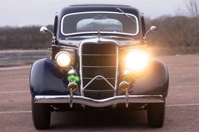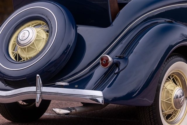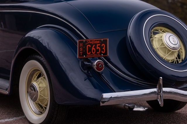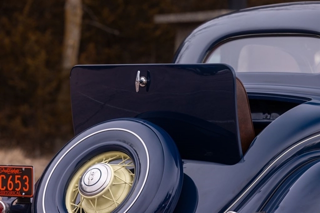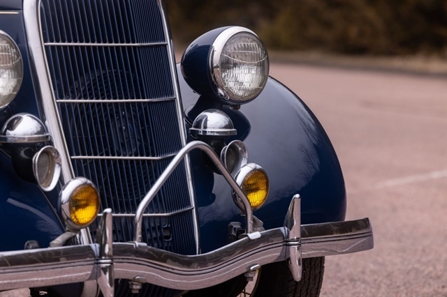 Finished in period-correct Washington Blue over a tan mohair interior, this coupe is a head-turner from every angle. The all-steel body features integrated fenders and streamlined bodywork that marked Ford`s major 1935 design evolution. Highlights include 16-inch Kelsey-Hayes wire wheels, wide whitewall tires, a factory rumble seat, fold-down rear window, classic banjo steering wheel, rear-mounted spare, and period-correct instrumentation throughout.