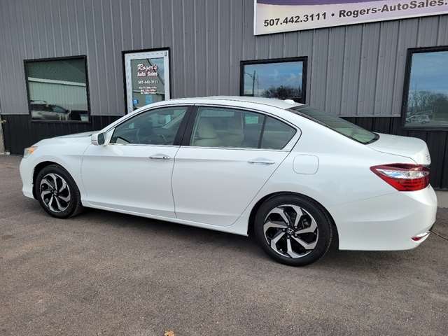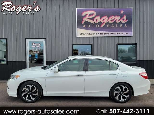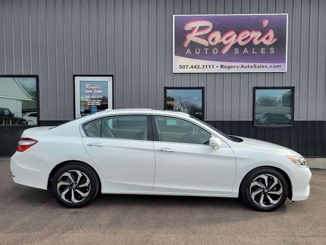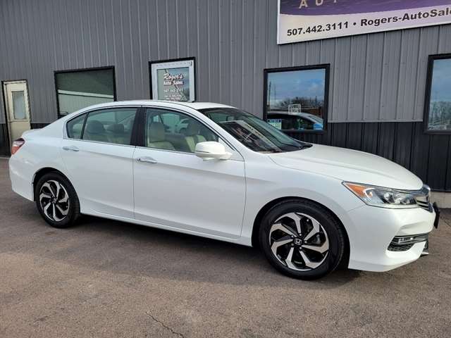 Experience the thrill of the open road in this sleek Pearl White 2016 Honda Accord Sedan. Fueled by a powerful 2.4L 16-Valve DOHC i-VTEC I-4 engine and innovative Continuously Variable Transmission with Sport Mode, this sedan offers a smooth and responsive driving experience. Whether cruising around town or embarking on a road trip adventure, the Front-Wheel Drive ensures stability and control in any situation. With a sporty 3.24 Axle Ratio, your acceleration will be as exhilarating as it is efficient. The elegant exterior features stylish 17 Alloy Wheels, a sunroof for soaking up the sun, and front fog lamps for added visibility. Inside, enjoy the comfort of leather-trimmed seats, dual-zone automatic climate control, and a HomeLink garage door transmitter for added convenience. Safety is a priority with dual-stage airbags, a rearview camera, and rear child safety locks. This Honda Accord is more than just a sedan - it`s a lifestyle upgrade waiting for you to take the wheel and enjoy the ride. Visit Rogers Auto Sales Inc. online at www.rogers-autosales.com to see more pictures of this vehicle or call us at 507-442-3111 today to schedule your test drive.