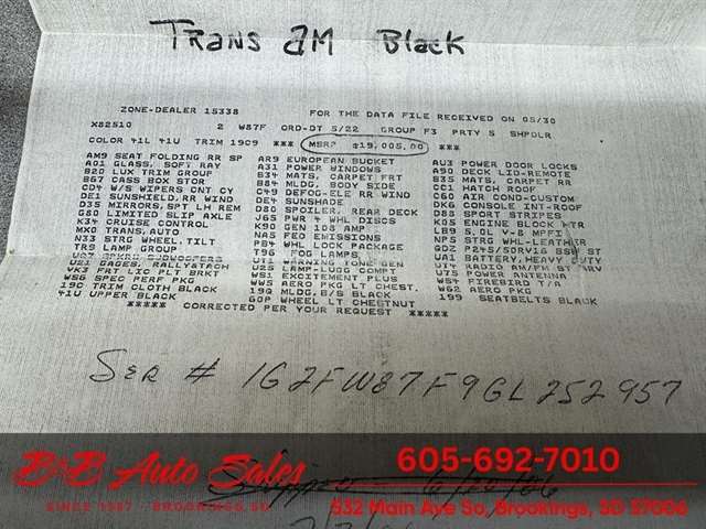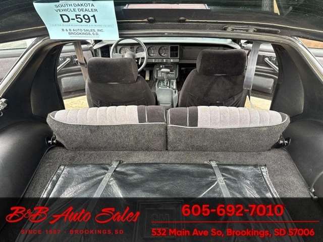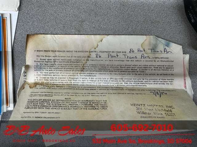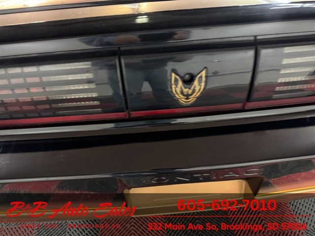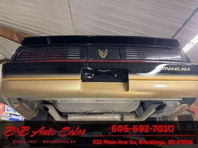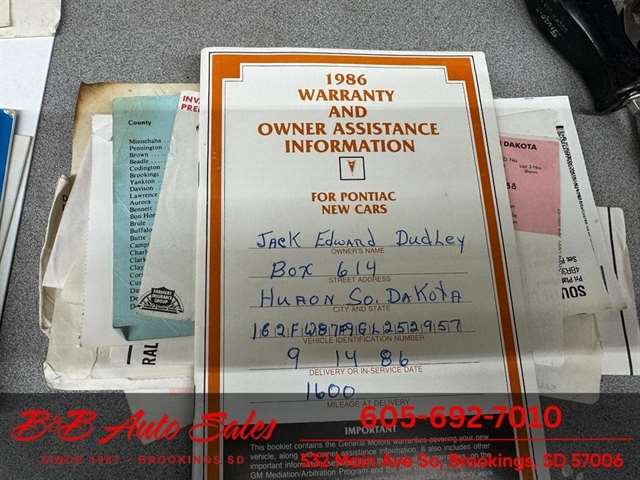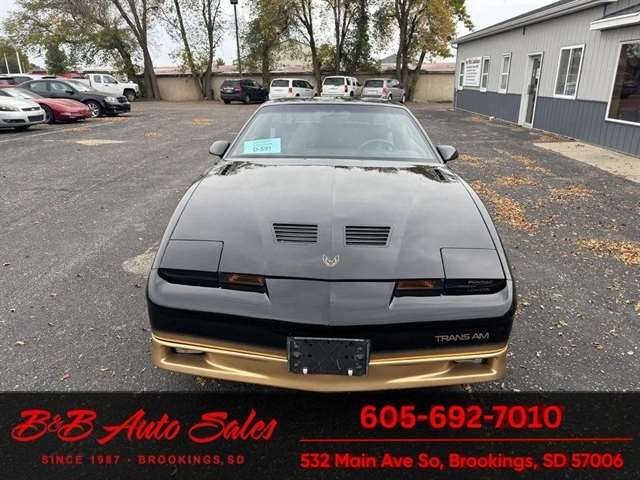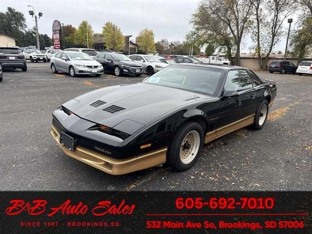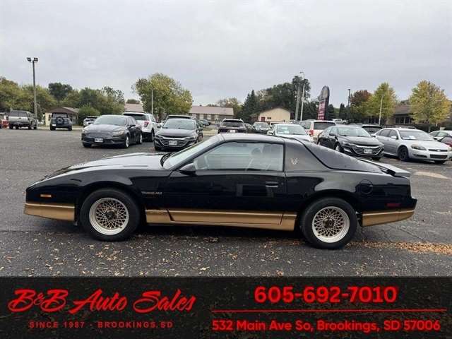 *5.0 Tuned Port V8*One Family Owned*T-Tops*Automatic*60,000 low miles MECHANICAL- This Firebird has been thru our inspection and we replaced the blower motor and converted AC to R134. EXTERIOR- The body is in great shape. It has had a repaint at one time an a nice job. It has a good shine to it with no rust issues. See the video for an up close inspection. Text Dirk at 605-695-7391 for running and driving video`sINTERIOR- The interior is in good shape with no issues.DIRK`S COMMENTS- With 38 years of experience I will give you my opinion of the Firebird. It is a cool car and being a 1 family owned car from Huron it`s whole life has some cool history. A great color combination and you can`t beat a black T/A for looks. UNDERNEATH- The underneath is solid, there is some surface rust from being in storage. History- A car from Huron .SD and one family owned. TEST DRIVE- We personally test drive our vehicles so we know what they drive like. I have drove this one 40 miles and it drives good.Located at 324 W Main White,SD 57276BUY WITH CONFIDENCE as this 1986 Pontiac Firebird has gone thru inspection and test drive. We personally work and drive these ourselves so can answer any questions you may have. We show you any issues with over 100 pictures and videos of a walk around, running and driving.VALUE- We price our vehicles to market value and try to be one of the best prices of vehicles in comparable condition. Our goal is to give you a good buy on a vehicle you are going to have fun with and enjoy. We do have a document fee but only $50 which is lower than most other dealers.LIKE IT OR RETURN IT- As being in business for 38 years we do not want to sell anybody a vehicle they do not want. As many of our vehicles are sold site unseen we will take the vehicle back and give a refund minus shipping and a restocking fee. You are responsible for the shipping both ways and a $1000 restocking fee. You have 3 days to notify us you are not happy with the vehicle and we will start the return process. Ask for more details.VIDEOS- Call, text or email for videos of driving the vehicle and of the engine running and accessories working. Text Dirk at 605-695-7391. Click here to apply for financing: Credit App Call or text Dirk at 605-695-7391 or Darren 605-695-9555 with any questions. B and B Auto Sales, 324 W Main White,SD 57276